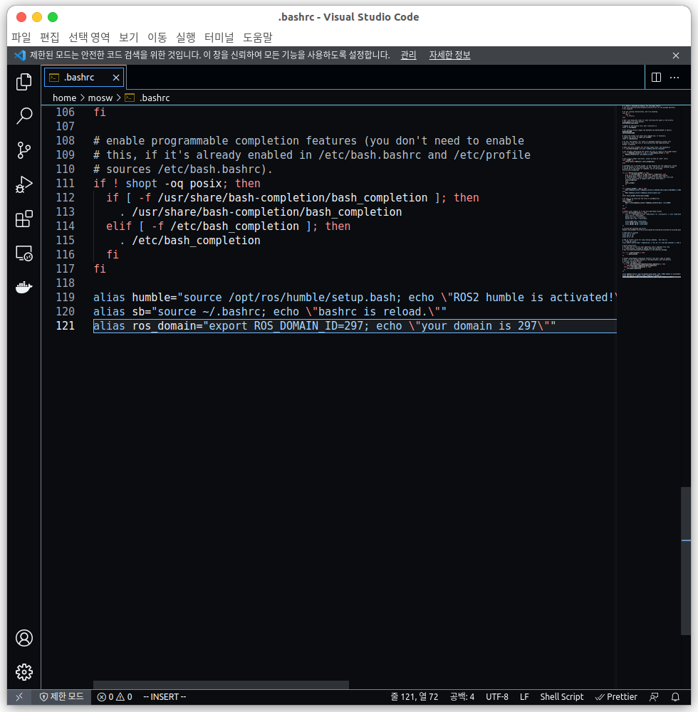 : ํ์ฌ์ ๊ฐ์ ๋ฐฉ์์ ์ง๊ธ ์ฌ์ฉํ๋ ROS ๋ฒ์ ์ ๋ฌด์กฐ๊ฑด ๋ถ๋ฌ์ค๊ธฐ ๋๋ฌธ์ ๋ค๋ฅธ ๋ฒ์ ์ ROS๋ฅผ ์ด์ฉ ๋ชปํ๋ ๋ฑ์ ๋ฌธ์ ๊ฐ ์๊ธธ ์ ์๋ค. ๋ฐ๋ผ์ alias๋ผ๋ ๋ช ๋ น์ด๋ฅผ ํตํด ํน์ ๋จ์ด๋ฅผ ์ ๋ ฅํ์ ๋ ๋ช ๋ น์ ์คํํ๊ฒ ๋๋ค. ๋จ์ถ์ด์ ๋น์ทํ๋ค๊ณ ์๊ฐํ๋ฉด ๋๋ค.