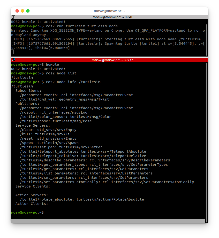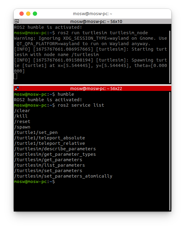 ์ดํ ros2 service list๋ฅผ ํ์ธํ๋ค๋ฉด turtle1๊ณผ turtle2๊ฐ ๋ชจ๋ ์๋ ๊ฒ์ ํ์ธ ๊ฐ๋ฅํ๋ค.
