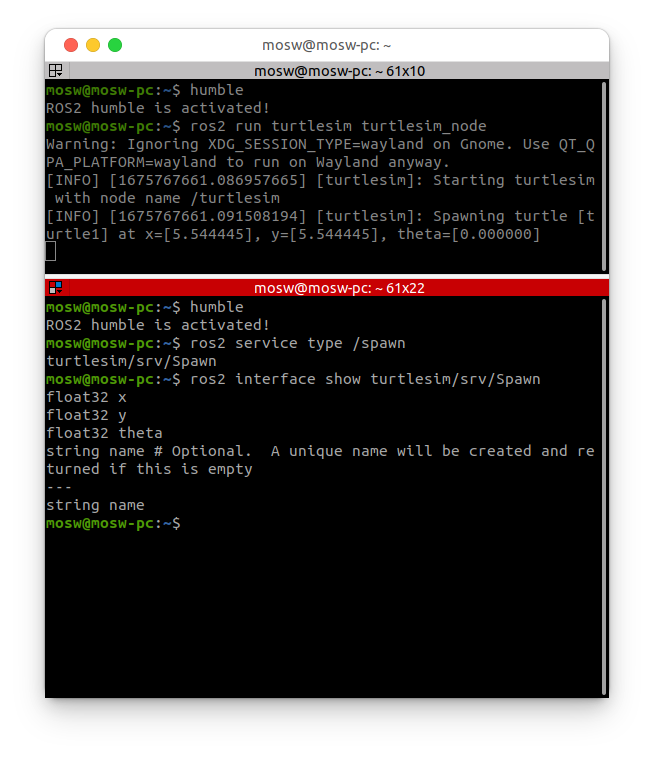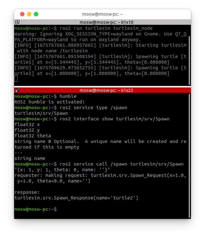 ros2 service call /spawn turtlesim/srv/Spawn "{x: 1, y: 1, theta: 0, name: ''}"