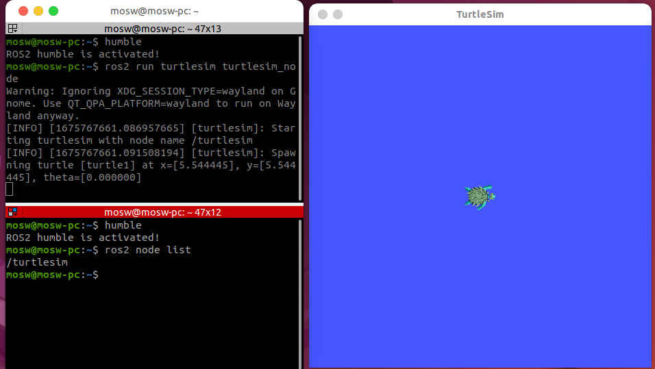 ์ดํ humble๋ก ์ ์ ๋ช ๋ น์ด๋ฅผ ์ค์ ์ ํ์์ผ๋, ์ด๋ฅผ ํตํด ROS2๋ฅผ ํ์ฑํ๋ฅผ ์์ผ์ฃผ๊ณ , turtlesim ๋ ธ๋๋ฅผ ์คํ์ํค๋๋ก ํ๊ณ ์ ํ๋ค.