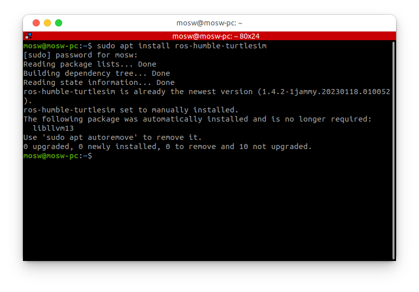 ๋จผ์ , turtlesim์ ROS๋ฅผ ์ค์นํ ๋ desktop ๋ฒ์ ์ ์ ํํ๋ค๋ฉด ์ค์น๋์ง๋ง ๊ทธ๋ ์ง ์์๋ค๋ฉด ๋ค์์ ๋ช ๋ น์ด๋ก ์ค์น๊ฐ ๊ฐ๋ฅํ๋ค.