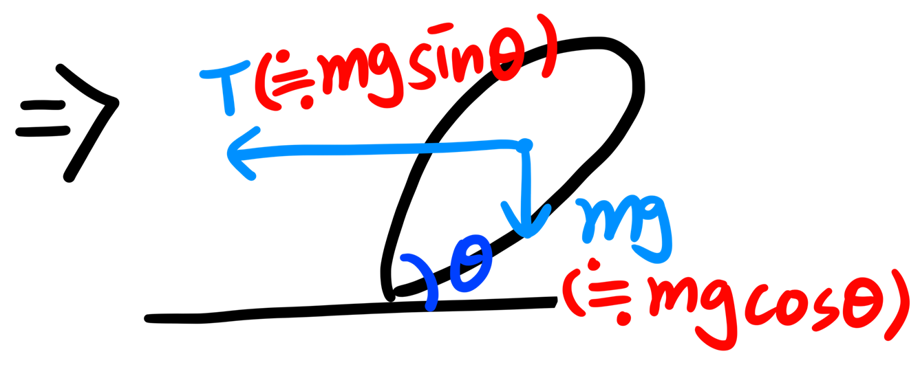 κ²½μ¬λ©΄μμμ μΈκ·Έμ¨μ΄μ μ½κ°μ λ³νλ₯Ό μ€λ€λ©΄ μμ κ·Έλ¦Όκ³Ό κ°μ λͺ¨μ΅μ΄ λλ κ²μ λ³Ό μ μλ€. κ²½μ¬λ©΄μμμ $mg\sin \theta$κ° μ₯λ ₯($T$)μΌλ‘, $mg\cos \theta$κ° μ€λ ₯($mg$)μΌλ‘ λμλλ€. λν κ²½μ¬λ©΄μ΄ μ§νλ©΄κ³Ό νννκ² λλ©΄μ κ²½μ¬κ°μ΄μλ $\theta$λ§νΌ μΈκ·Έμ¨μ΄κ° λλ λͺ¨μ΅μ΄ λλ€.